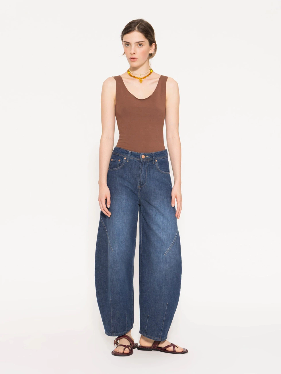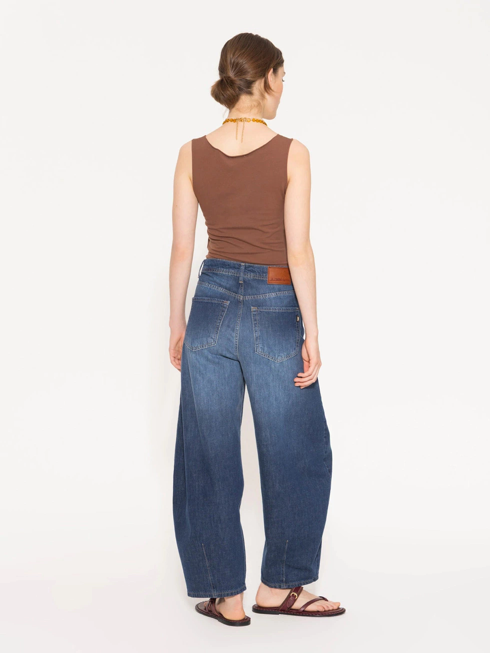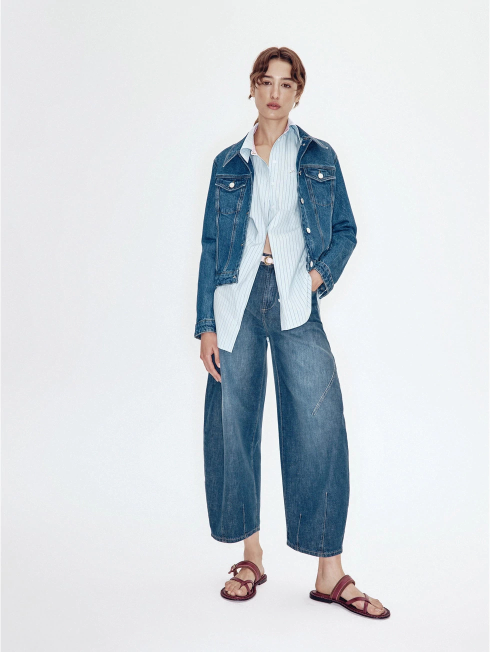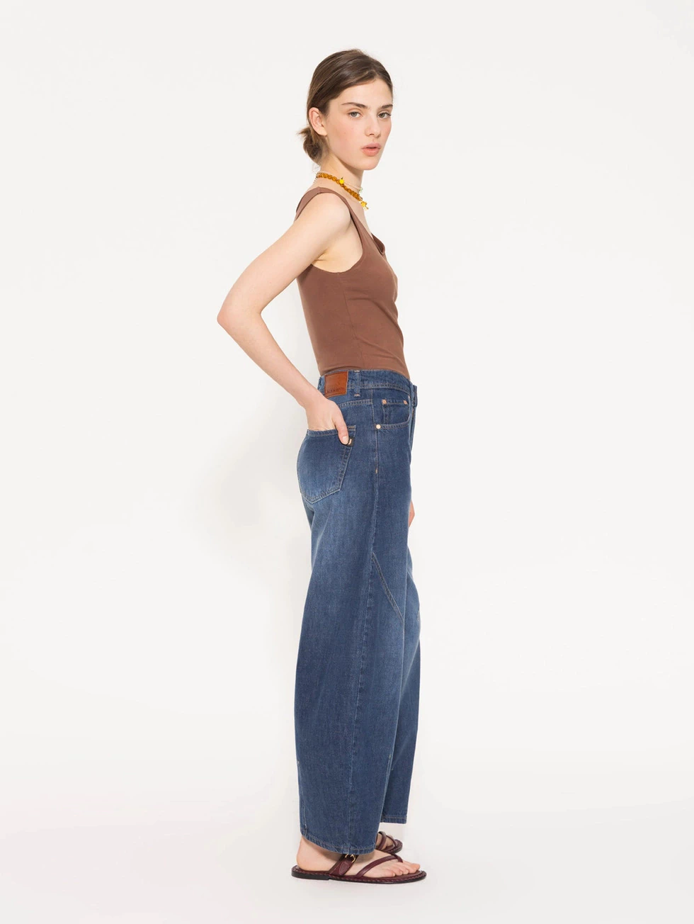 Jeans Eddie Mid de fit slouchy confeccionado en tejido liviano que aporta buena caída. Es de tiro medio y pinzas estratégicamente ubicadas que generan una silueta englobada hacia la botamanga.Composición: 67% algodón, 20% algodón reciclado, 13% lino recicladoReferencia modelo Lena: Altura 1,75 Talle: 22Completa el look Musculosa Jazzy y Sandalia Rivera