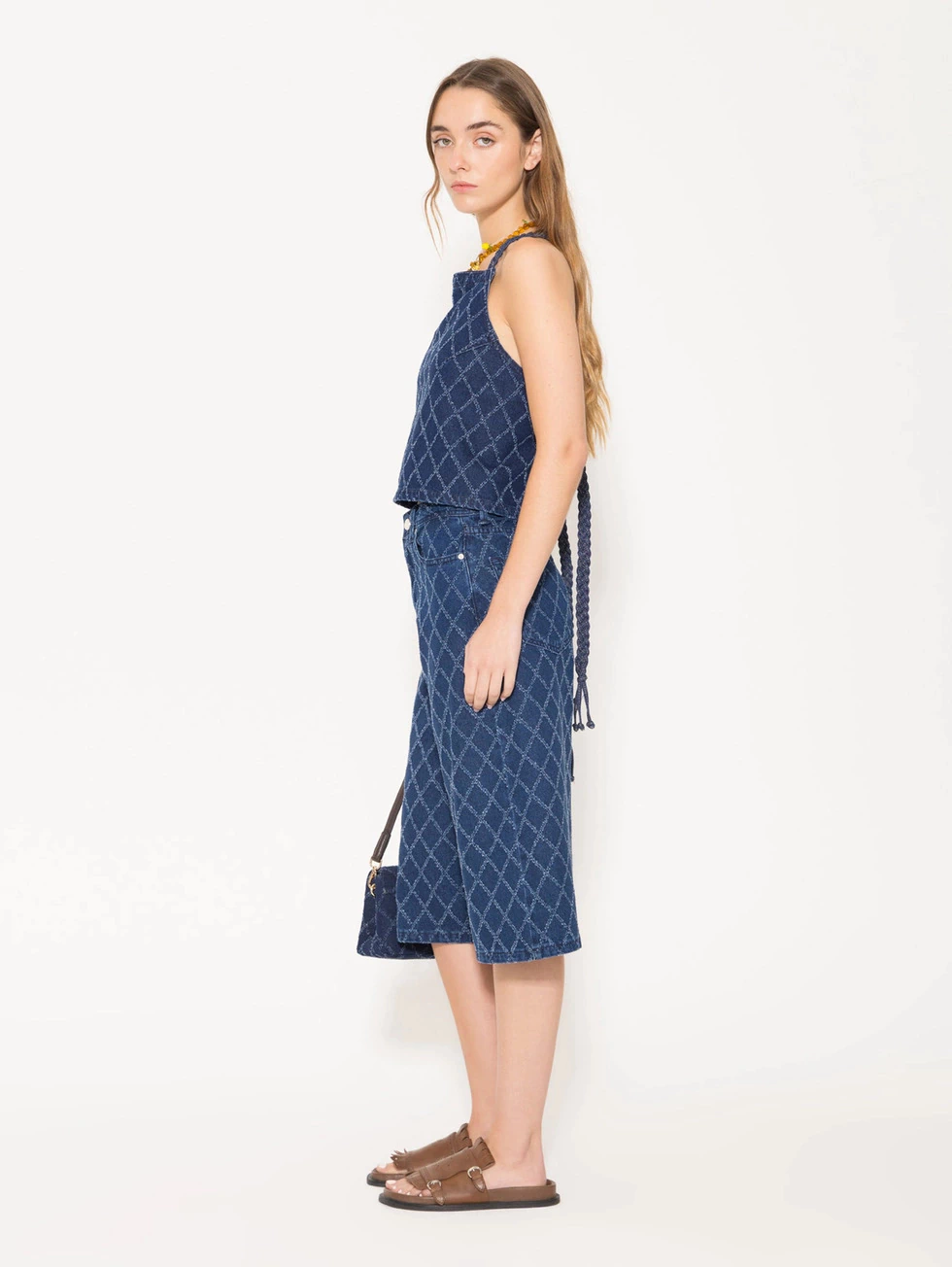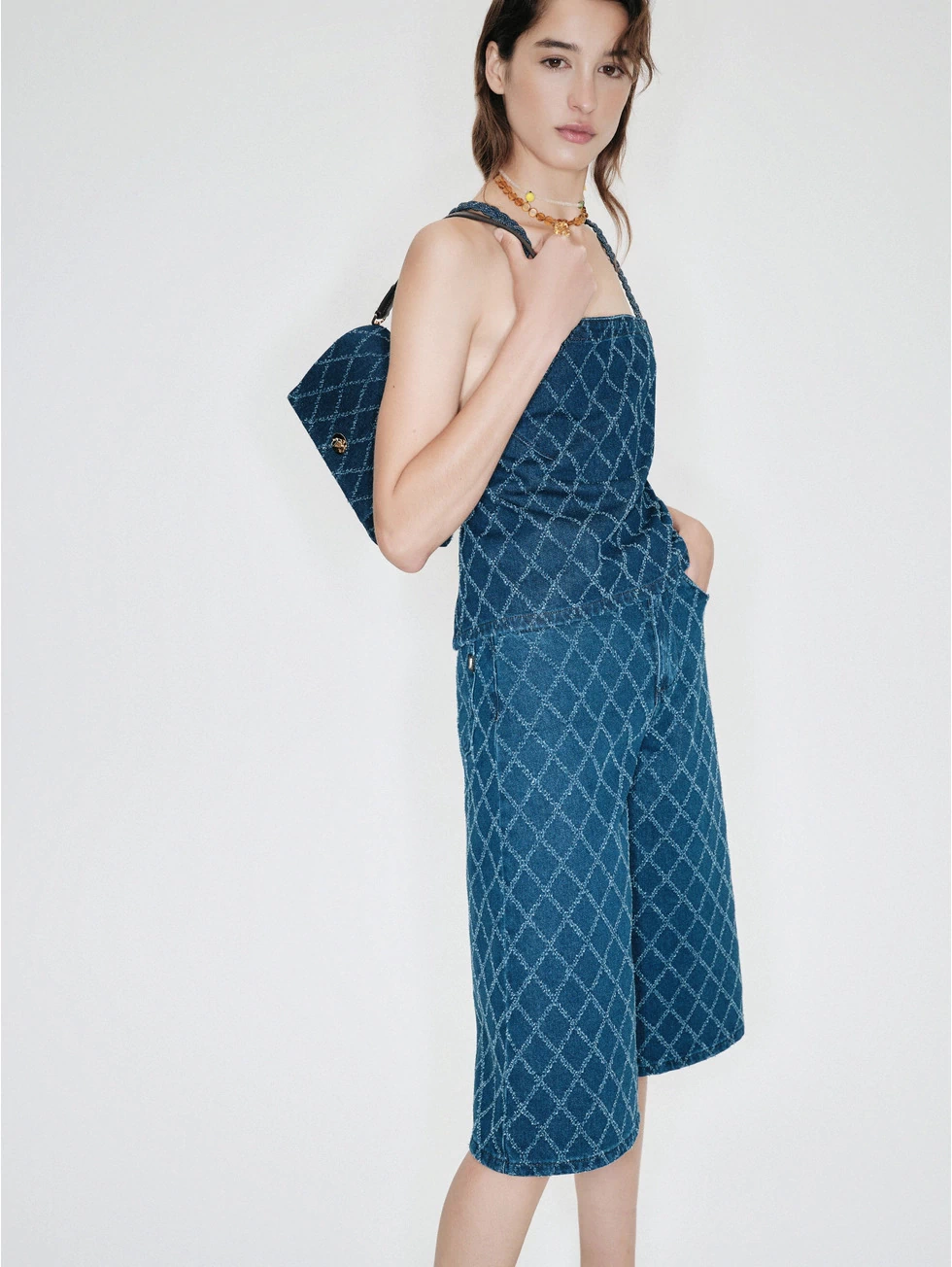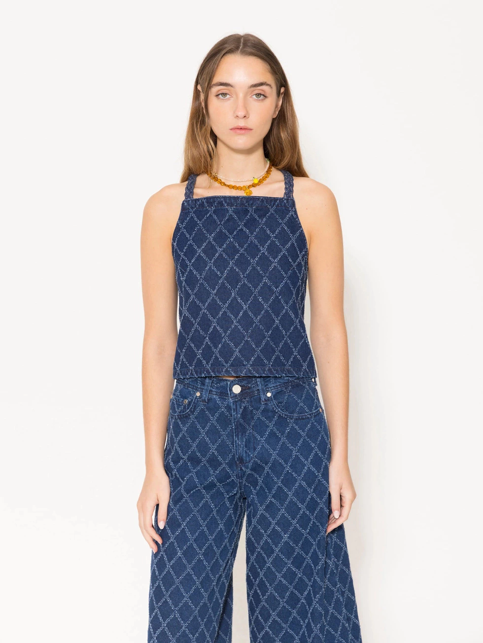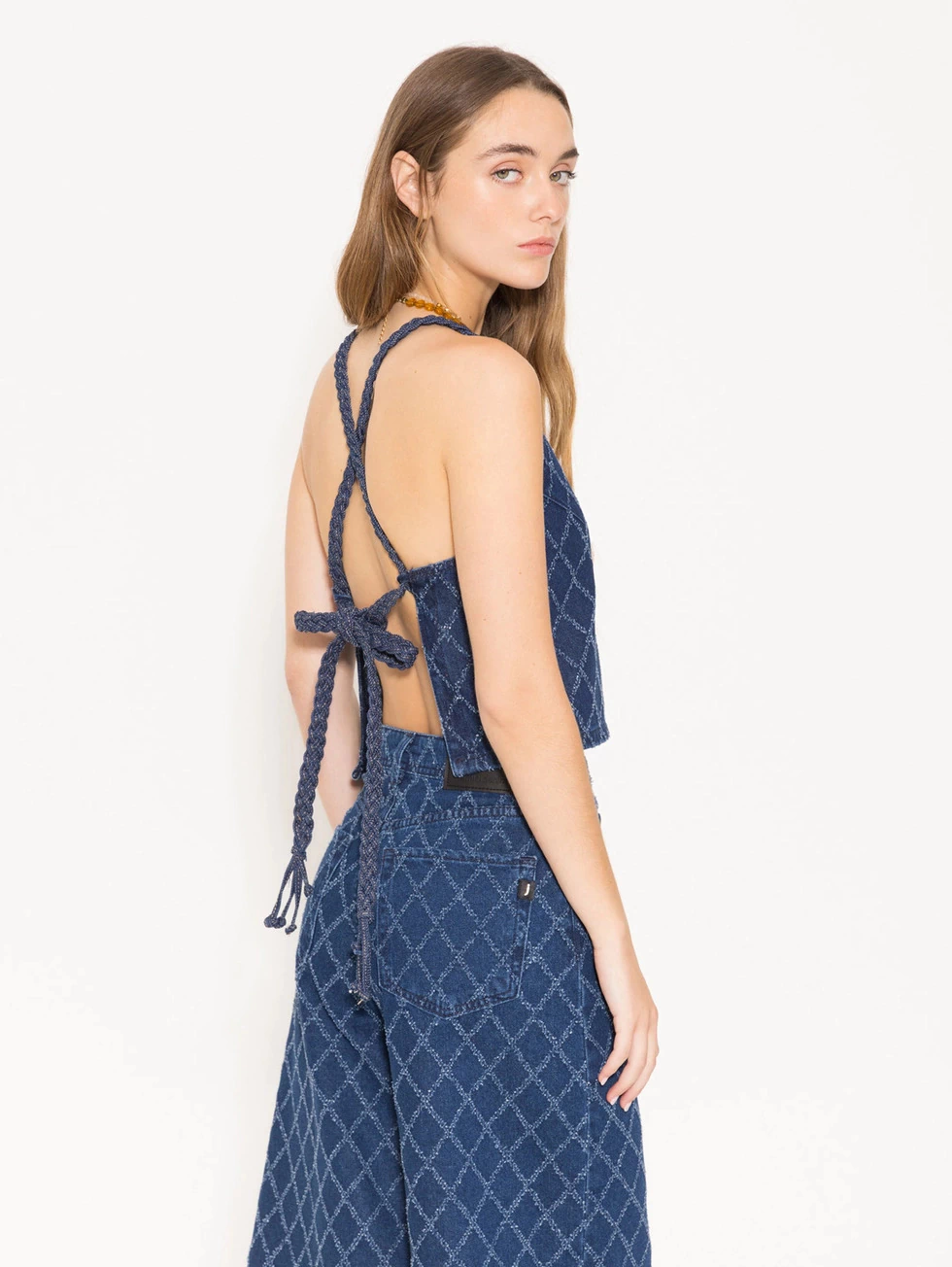 Top Square tipo pechera confeccionado en denim con textura y diseño de rombos. Viene con breteles ajustables en cordón trenzado en espalda.Composición: 100% algodónReferencia modelo Delfina: Altura 1,74 Talle: 1Completa el look Bermuda Square y Sandalia Moon