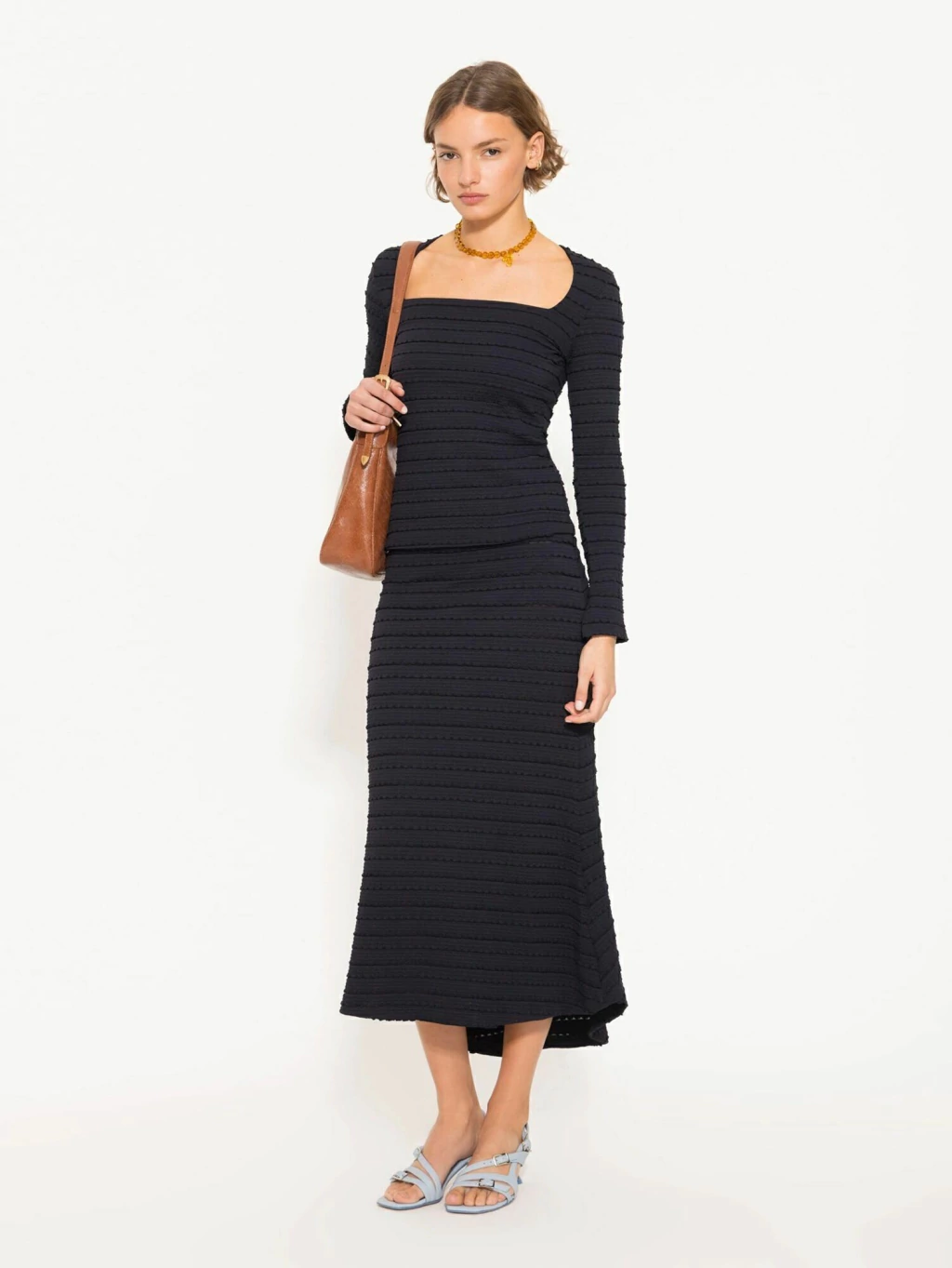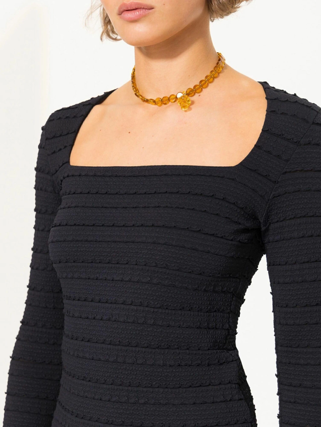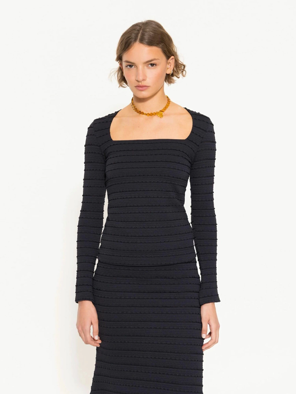 Top Suri confeccionado en tela de punto fantasía, con calce al cuerpo que realza la silueta. Lleva escote cuadrado bien amplio y mangas largas, logrando un diseño moderno y femenino ideal para complementar looks de día o de noche.